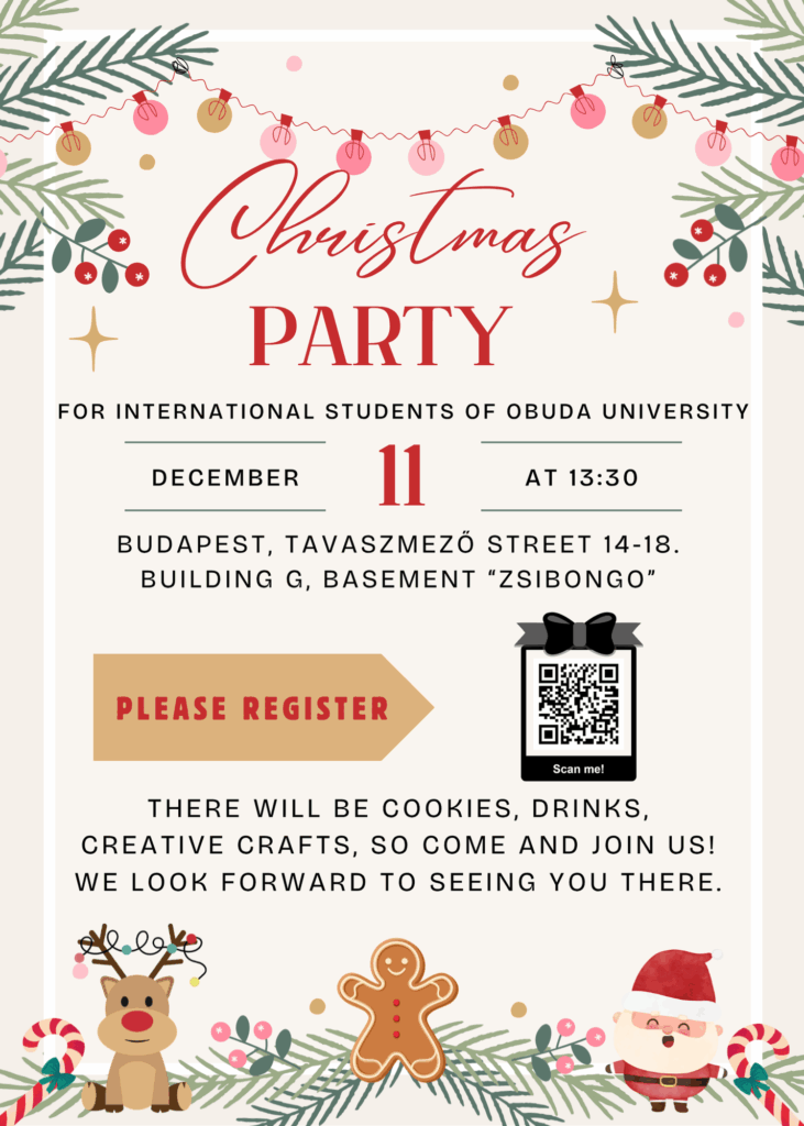 The Keleti Károly Faculty of Business and Management and the Kandó Kálmán Faculty of Electrical Engineering warmly invite international students to a Christmas and end-of-year party. There will be cakes, drinks, creative crafts. We look forward to seeing you there!