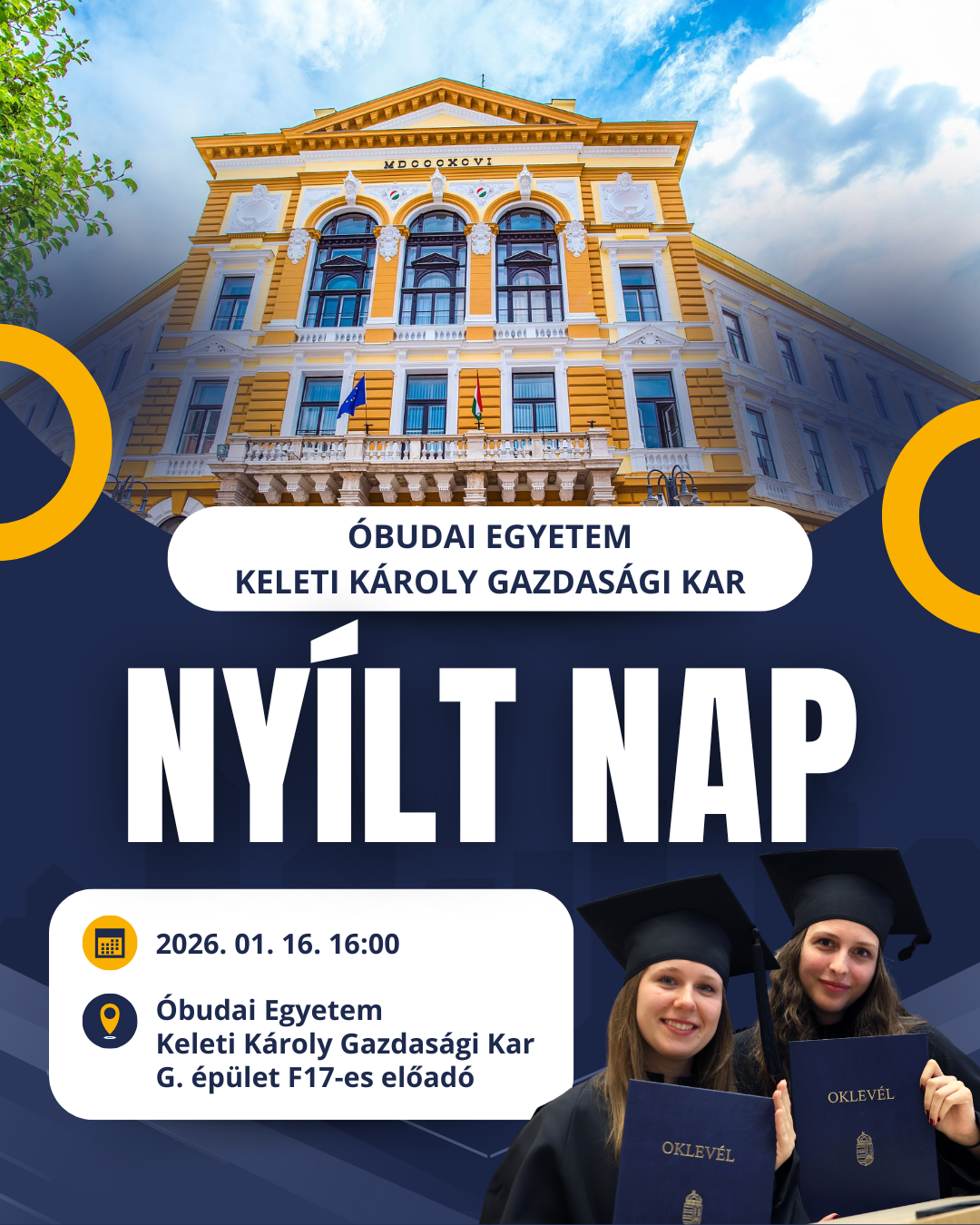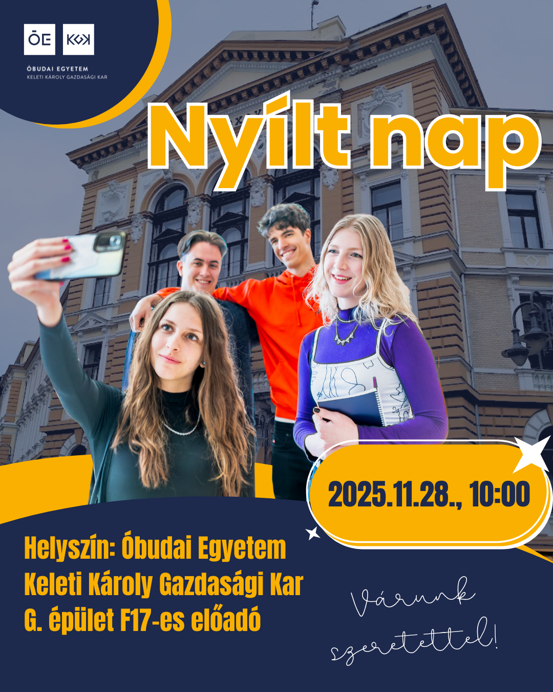 A Keleti Károly Gazdasági Kar szeretettel várja az érdeklődő fiatalokat a Kar életét és képzéseit bemutató nyílt napra. Az eseményen nemcsak a Kar által nyújtott képzések kerülnek bemutatásra, hanem a fiatalok megismerhetik az intézmény működését, sétát tehetnek az egyetem épületeiben és alaposabb betekintést nyerhetnek az egyetemista lét mindennapjaiba.